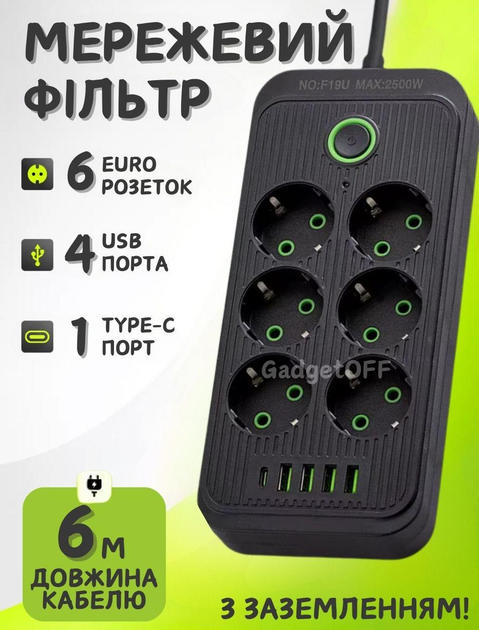 Подовжувач мережевий переноска 6м на 6 розеток + 4USB, 1Type-C UA Power F06U Чорний