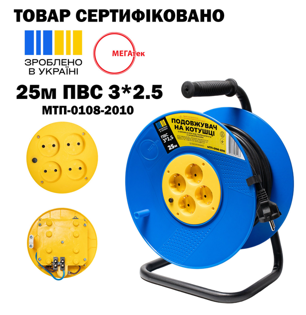 Подовжувач на котушці з вимикачем від перенапруги та з/з Мегатек 25м ПВС 3*2,5мм МТП0108-2010