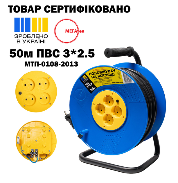 Подовжувач на котушці з вимикачем від перенапруги та з/з Мегатек 50м ПВС 3*2,5мм МТП0108-2013
