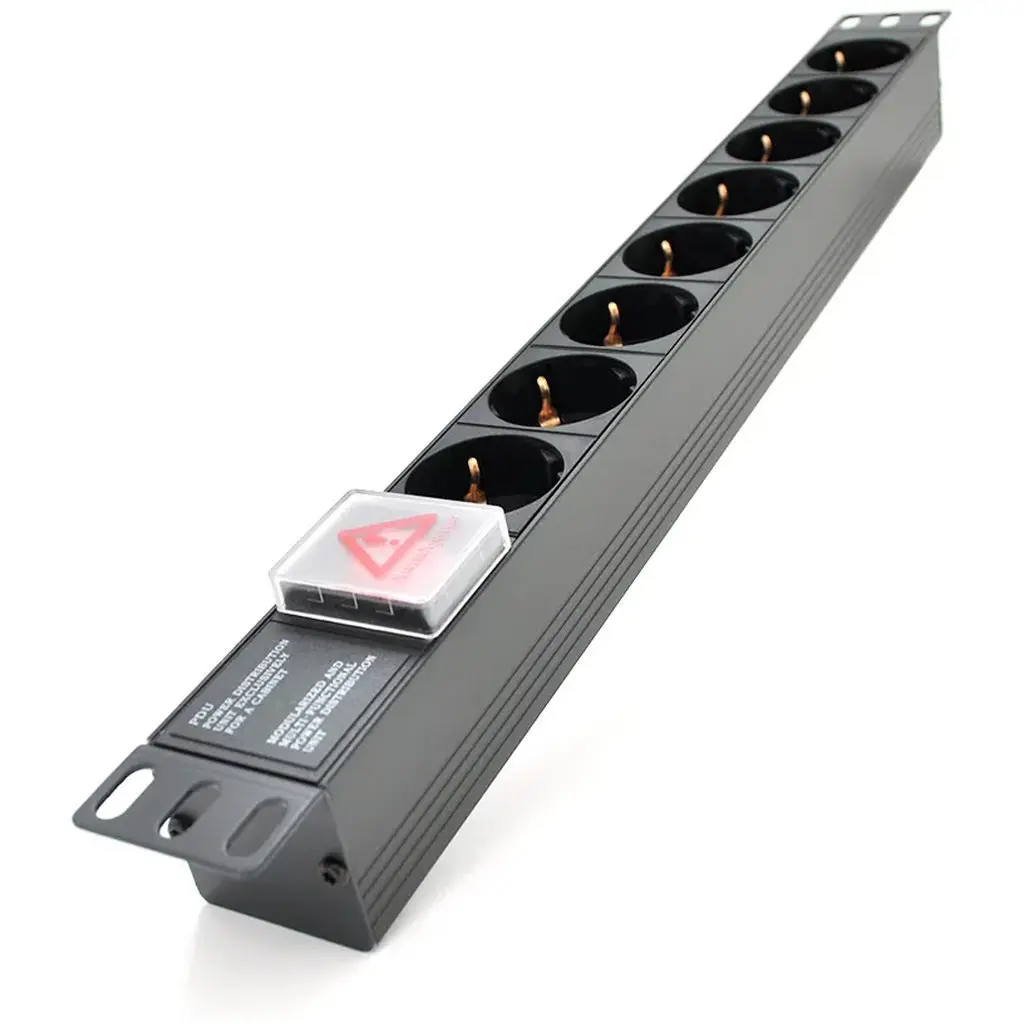 Подовжувач PiPo на 8 розеток з вимикачем, 220В, німецький тип, 1U 19", алюмінієвий корпус, чорний, (без кабелю живлення) Q25