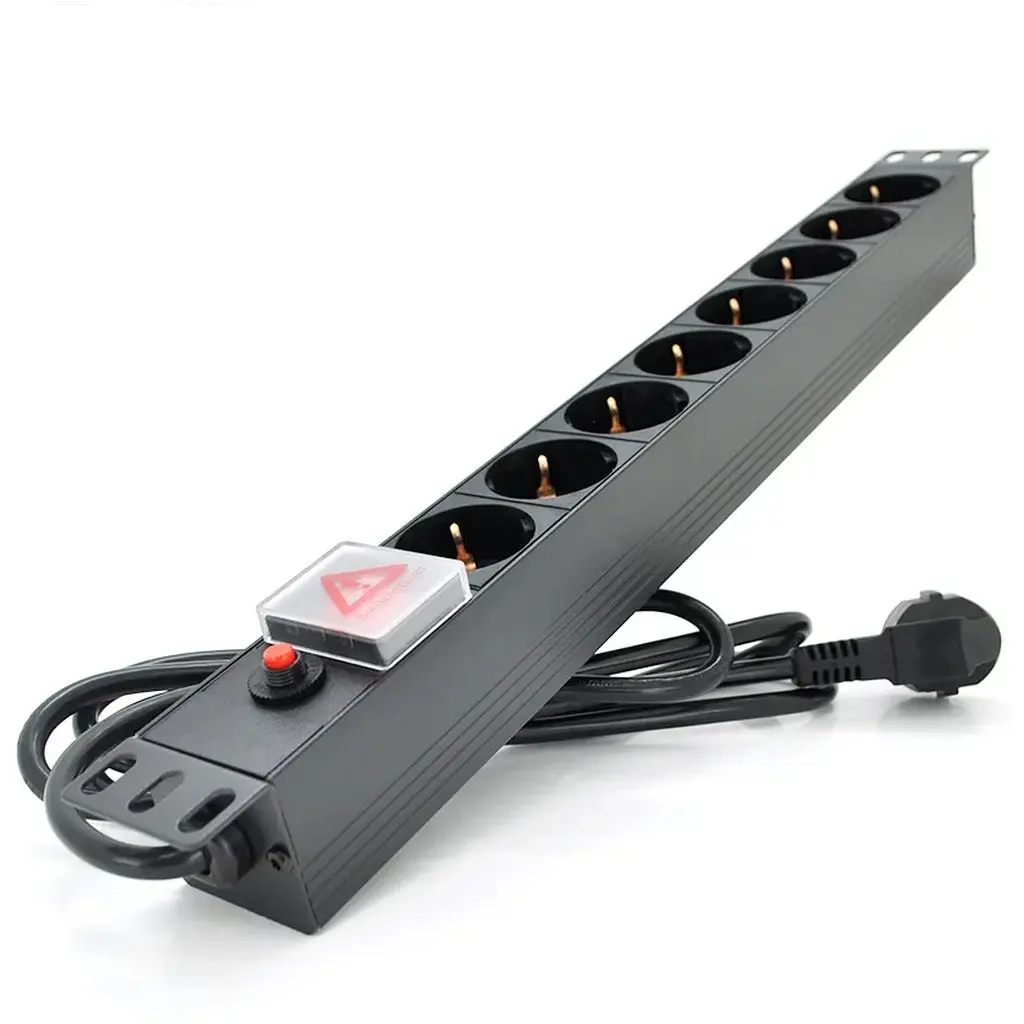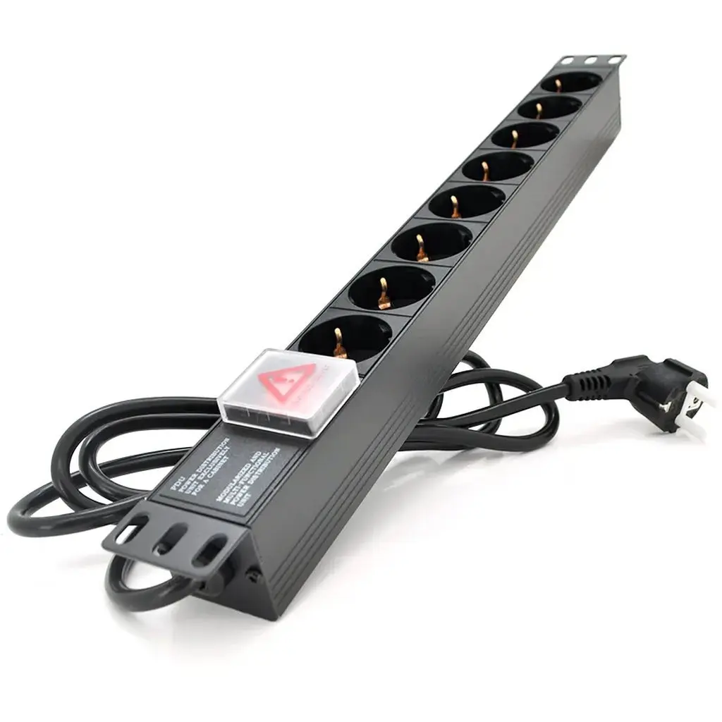 Подовжувач PiPo на 8 розеток з вимикачем + відсікач, 220В, німецький тип, 1U 19", алюмінієвий корпус, чорний довжина кабелю