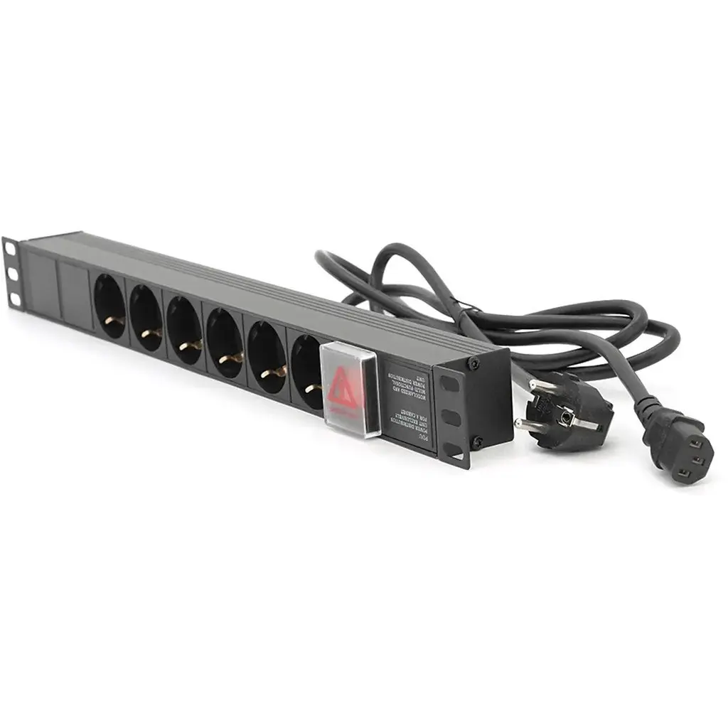 Подовжувач Ritar на 6 розеток з вимикачем, 220В, німецький тип, 1U 19 ", з адаптером живлення C13, алюмінієвий корпус, чорни