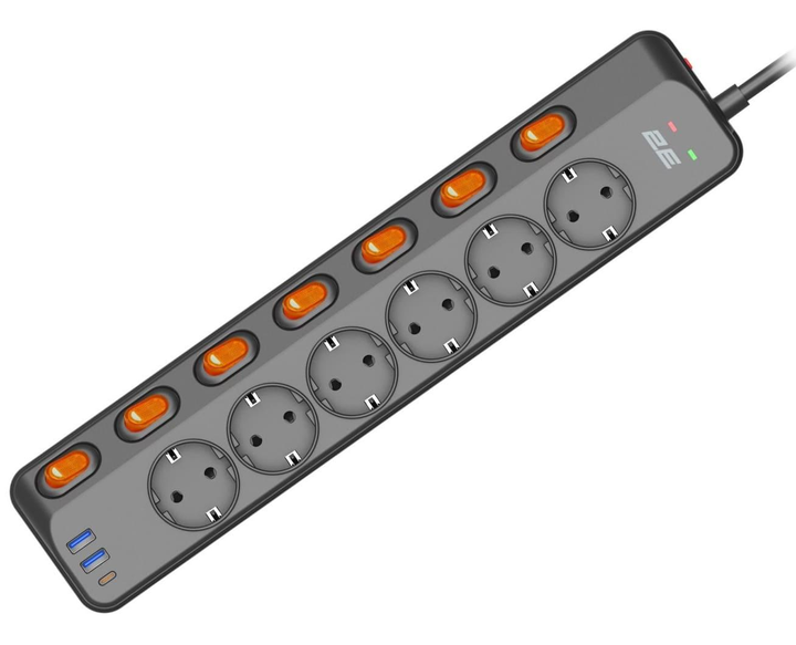 Подовжувач-фільтр мережевий 2E 6xТип F, 3x1.5мм кв, 16A, з захистом від перенапруги, 2xUSB-A, 1x USB-C, 3м, чорний