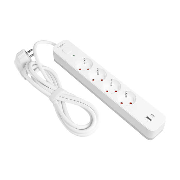 Подовжувач Videx 4 гнізда 3,4А USB(QC) USB-C(PD18W) 3 м із заземленням і вимикачем білий