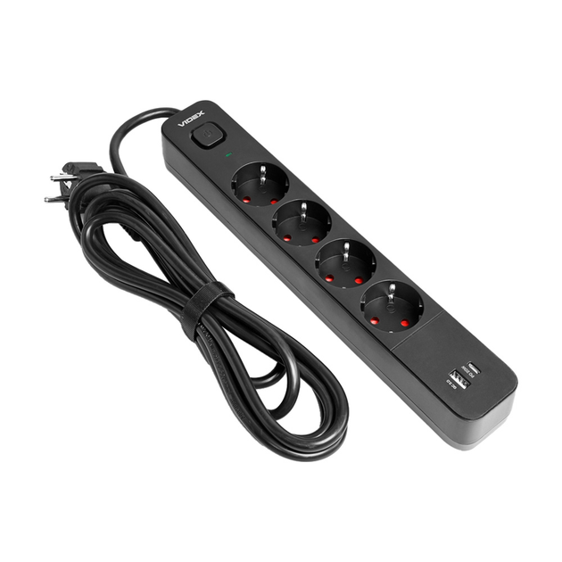 Подовжувач Videx 4 гнізда 3,4А USB(QC) USB-C(PD18W) 3 м із заземленням і вимикачем чорний