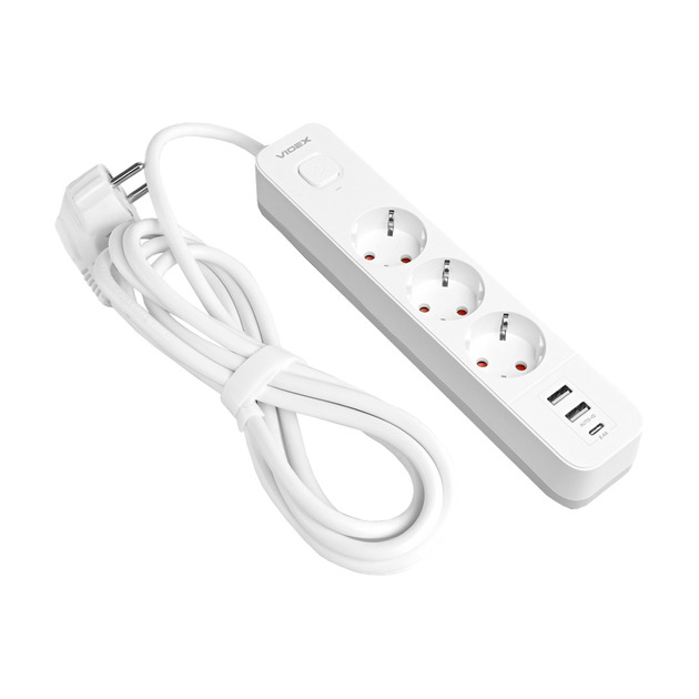 Подовжувач Videx 3 гнізда 3 м 2,4А 2USB+USB-C із заземленням і вимикачем білий