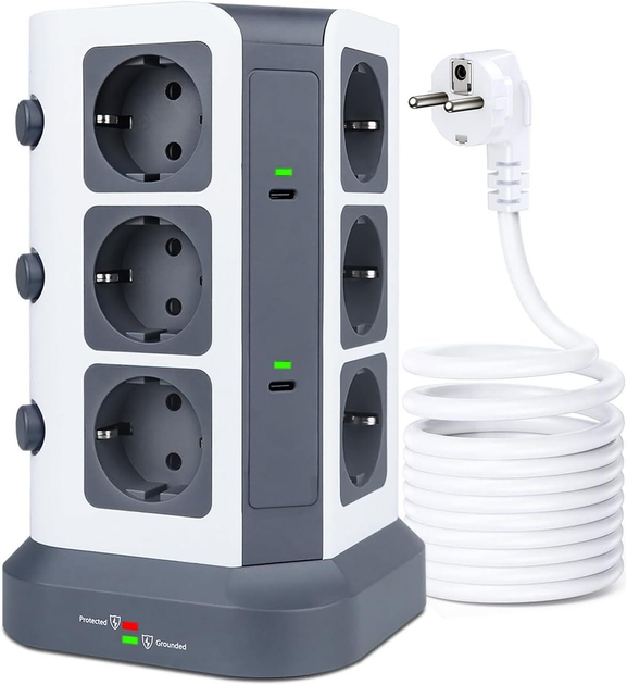 KOOSLA 12-розетковий подовжувач живлення 15 Вт 2-портовий PD Power Strip Підтримка PD3.0/PPS Tower з 3 USB A (4000 Вт/16 A).