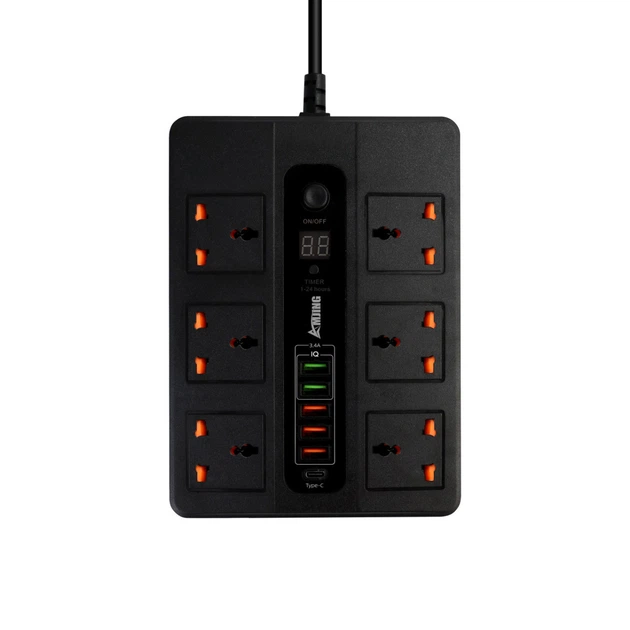 Мережевий фільтр BKL-11 з функцією таймера на 6 розеток 10А 250V + 1 PD20W + 1 QC3.0 + 4 USB, чорний
