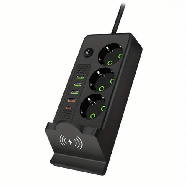 Універсальний мережевий фільтр-подовжувач з бездротовою зарядкою, 3 розетки, 4 USB, Type-C, кабель 3 м Без бренду