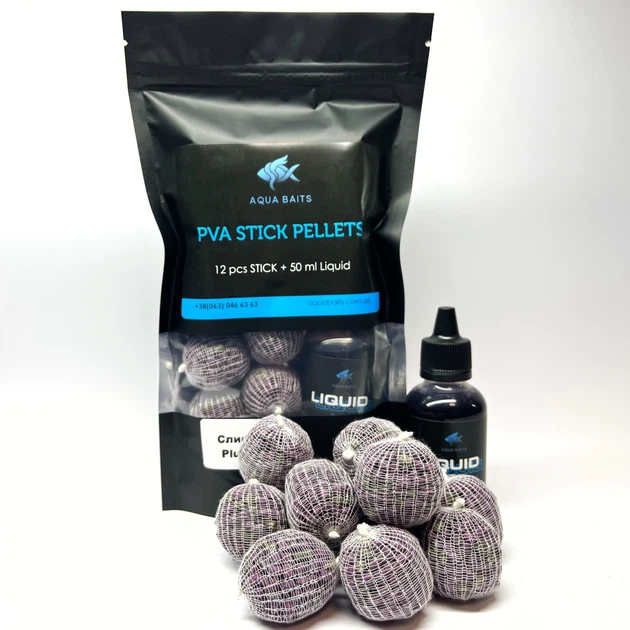 Готові ПВА стіки Aqua baits PVA Stick Pellets 12шт "Слива" 4 мм + 50 мл ліквіду