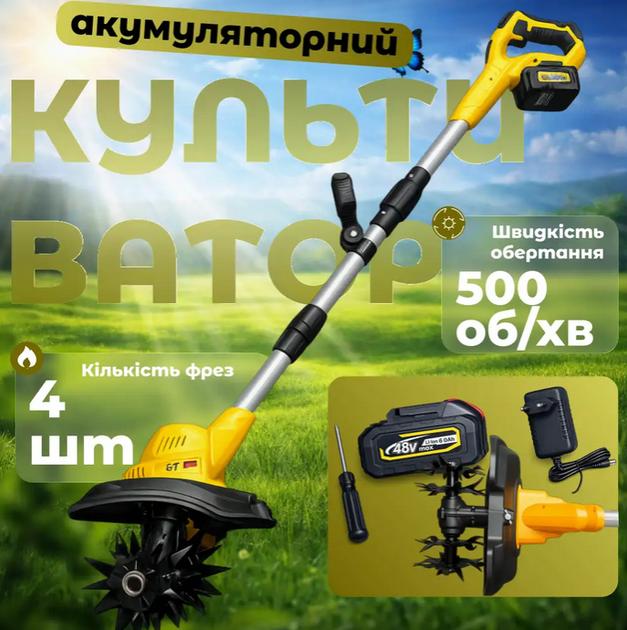 Культиватор акумуляторний 48V 6Ah з чотирма фрезами , жовтий