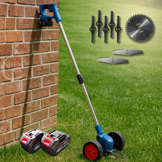 Тример для трави, кущів і бур'янів бездротовий з колесами та 2 акумуляторами 48V, акумуляторна косарка-тример для догляду за