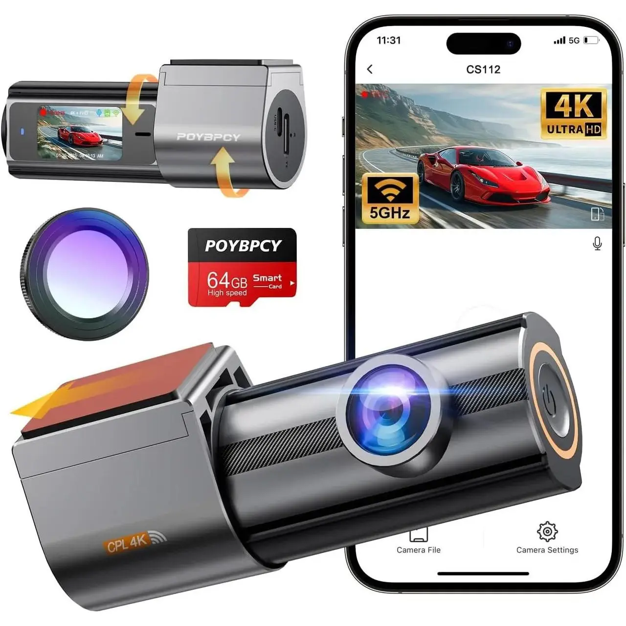 Відеореєстратор POYBPCY з 4K-камерою спереду і CPL-фільтром, дисплей 1,47 дюйма, SD-карта на 64 ГБ, керування через Wi-Fi 5G