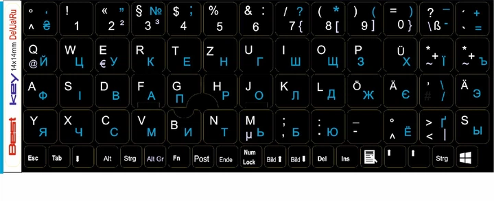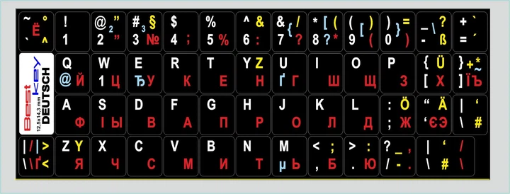 Нестираємі наліпки Німецькі, DE\UA\RU на клавіатуру Best Key матова ламінована непрозора, 71 кл.