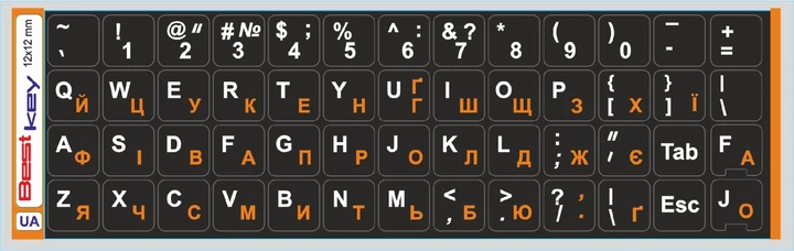 Нестираєма Українізована ламінована наліпка на клавіатуру Best Key чорна матова непрозора ПОМАРАНЧЕВА кирилиця, 52 кл. 12х12
