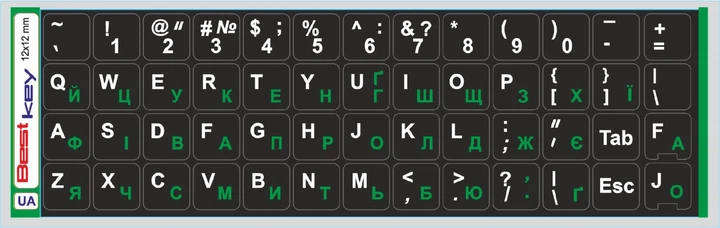 Нестираєма Українізована ламінована наліпка на клавіатуру Best Key чорна матова непрозора ЗЕЛЕНА кирилиця, 52 кл. 12х12мм.