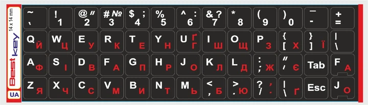 Нестираєма Українізована ламінована наліпка на клавіатуру Best Key чорна матова непрозора ЧЕРВОНА кирилиця, 52 кл. 14х14мм.