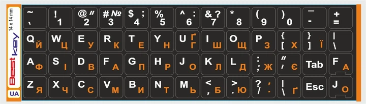 Нестираєма Українізована ламінована наліпка на клавіатуру Best Key чорна матова непрозора ПОМАРАНЧЕВА кирилиця, 52 кл. 14х14