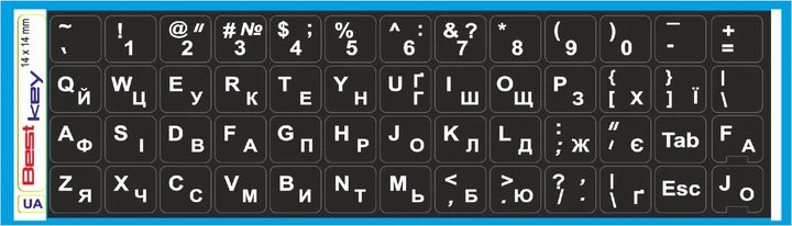 Нестираєма Українізована ламінована наліпка на клавіатуру Best Key чорна матова непрозора БЛАКИТНА кирилиця, 52 кл. 14х14мм.