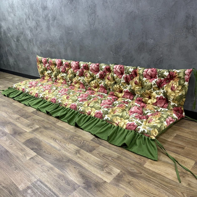 Подушка з каретною стяжкою на садові меблі Autumn flowers з рюшею панама 150х50х50 см бордова