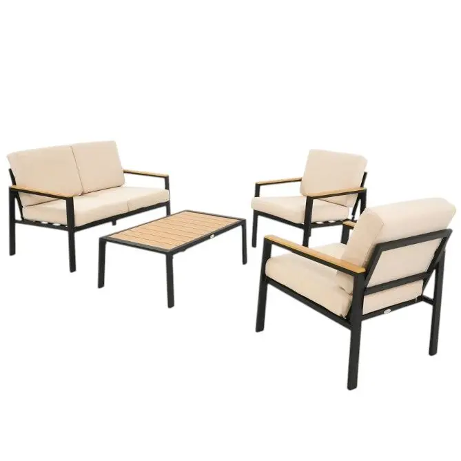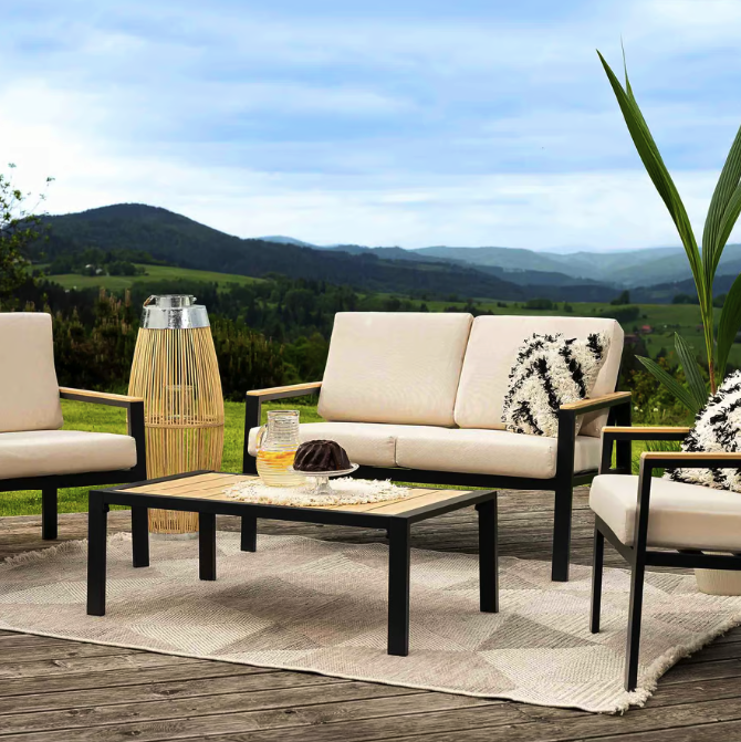 Набір елегантних і функціональних садових меблів Merano від Di Volio — гарантія успішного відпочинку на природі. Меблі для балкона, тераси, дачі є мінімалістичним сучасним дизайном, що ґрунтується на простих геометричних формах і приглушених кольорах. Цей стиль надає меблям універсального характеру та добре підходить до будь-якого інтер'єру. У комплекті двомісний диван, два крісла із широкими зручними сидіннями та журнальний столик. Стійкі до різних погодних умов матеріали — алюмінієвий каркас із порошковим фарбуванням і полівудом, що імітує дерево, забезпечують довговічність і зберігають естетичний вигляд меблів упродовж багатьох років використання. Комплект доповнений бежевими подушками.