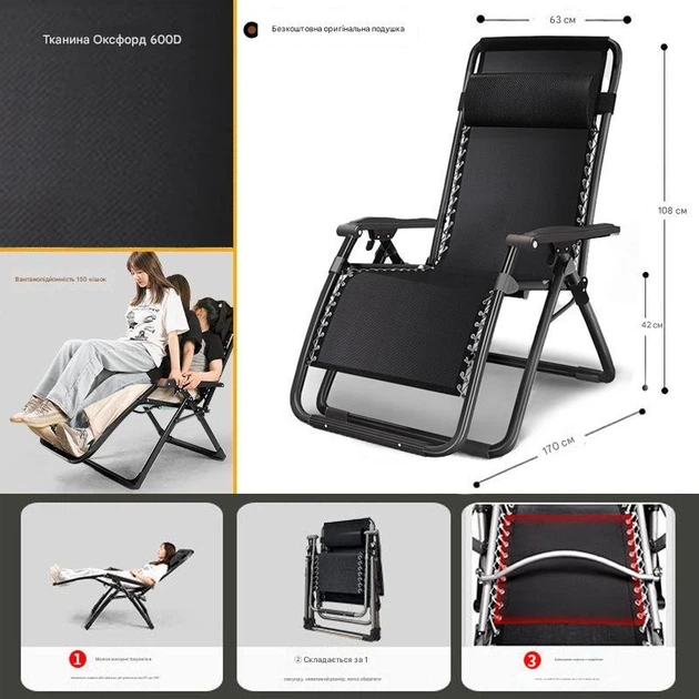 Розкладне пляжне крісло-шезлонг лежак для дачі, саду, тераси, 178x60x80 см