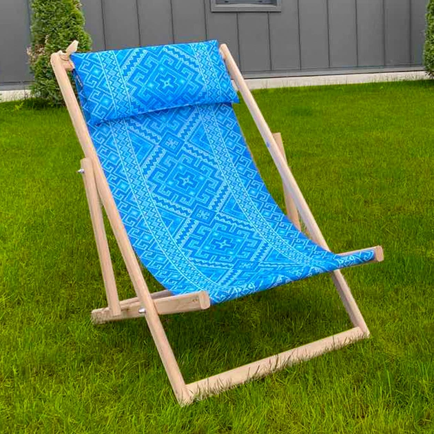 Шезлонг розкладний дерев’яний з подушкою та принтом Український орнамент на синьому фоні - садовий лежак для кафе, тераси, б