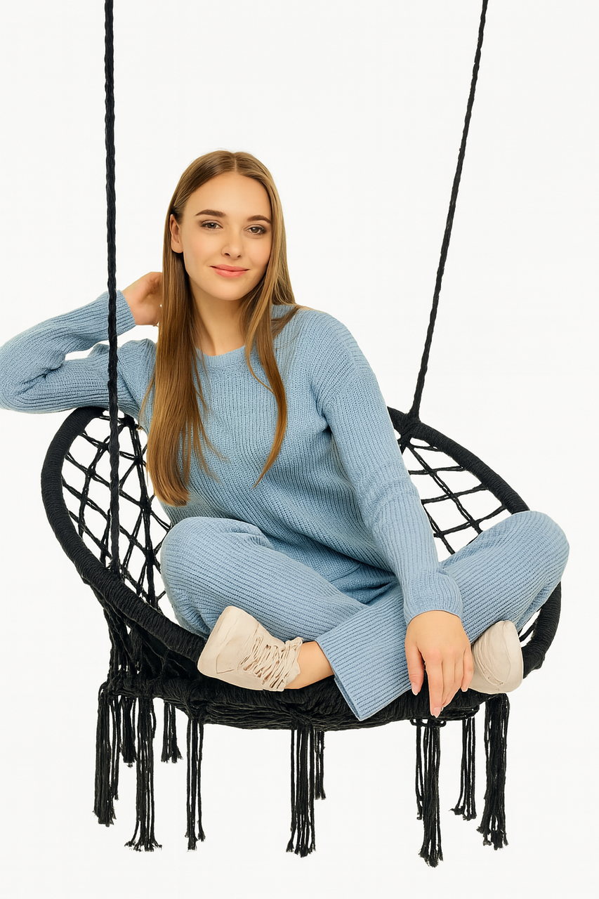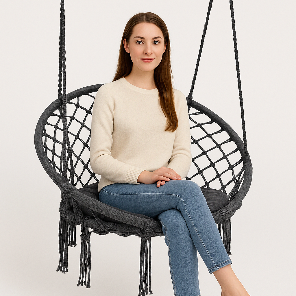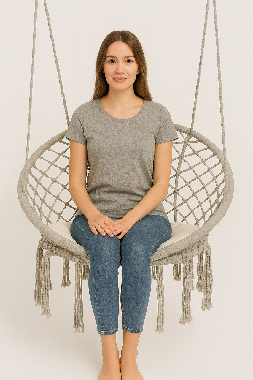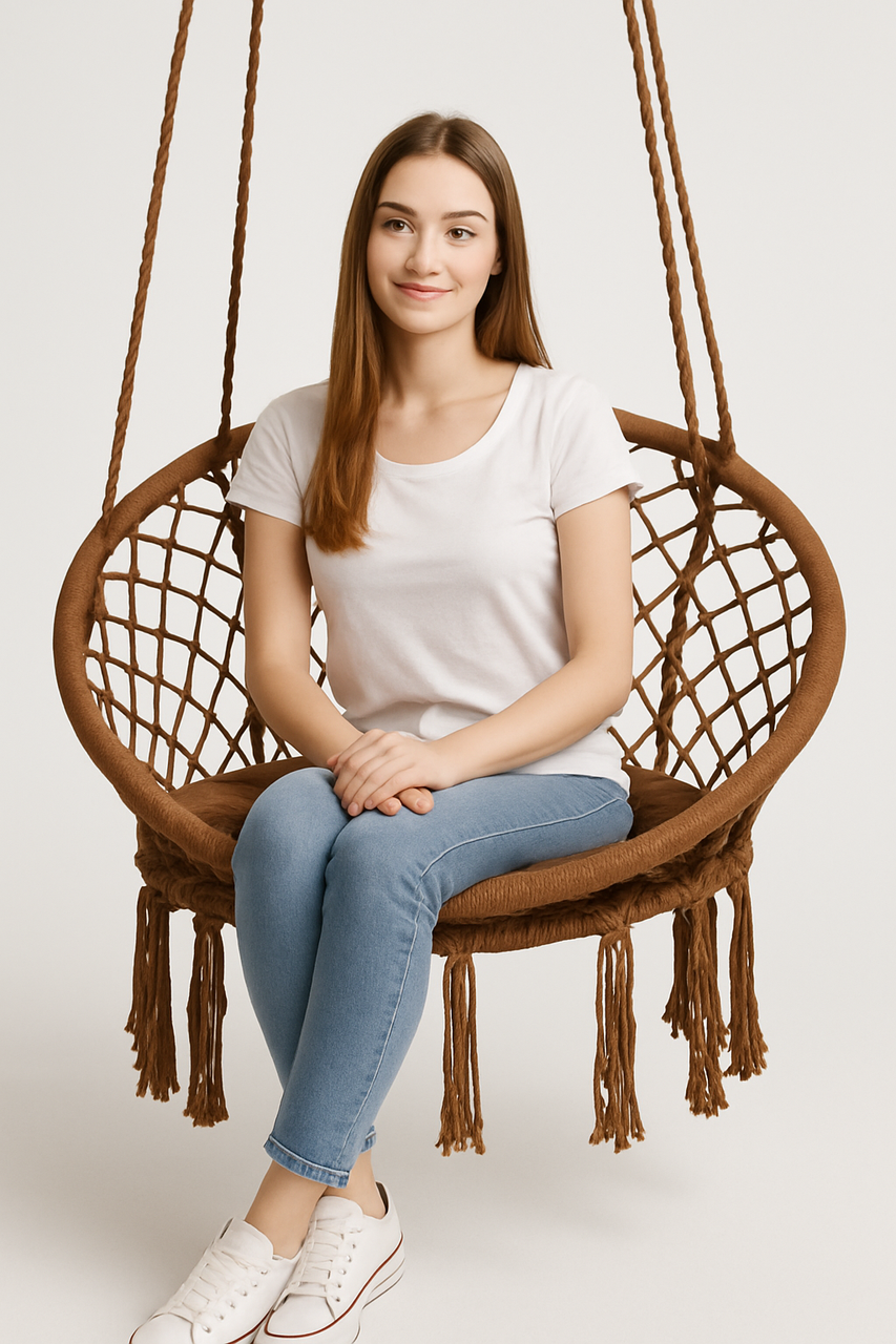 Крісло-гойдалка підвісна WCG 80 см + м’яка подушка Плетене кругле крісло в стилі бохо Відкрийте новий рівень комфорту з підвісною кріслом-гойдалкою WCG — ідеальне рішення для дому, балкона, саду чи лаунж-зони. М’яка подушка, приємний текстиль, декоративна бахрома та витончений дизайн створюють атмосферу спокою й затишку, яку хочеться дарувати собі щодня. Гойдалка