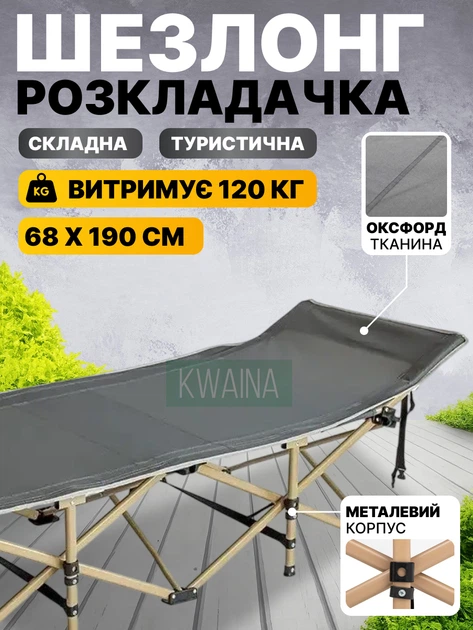 Шезлонг садовий пляжний розкладний 68х190, туристична розкладушка до 120кг, ліжко складане похідне, сірий