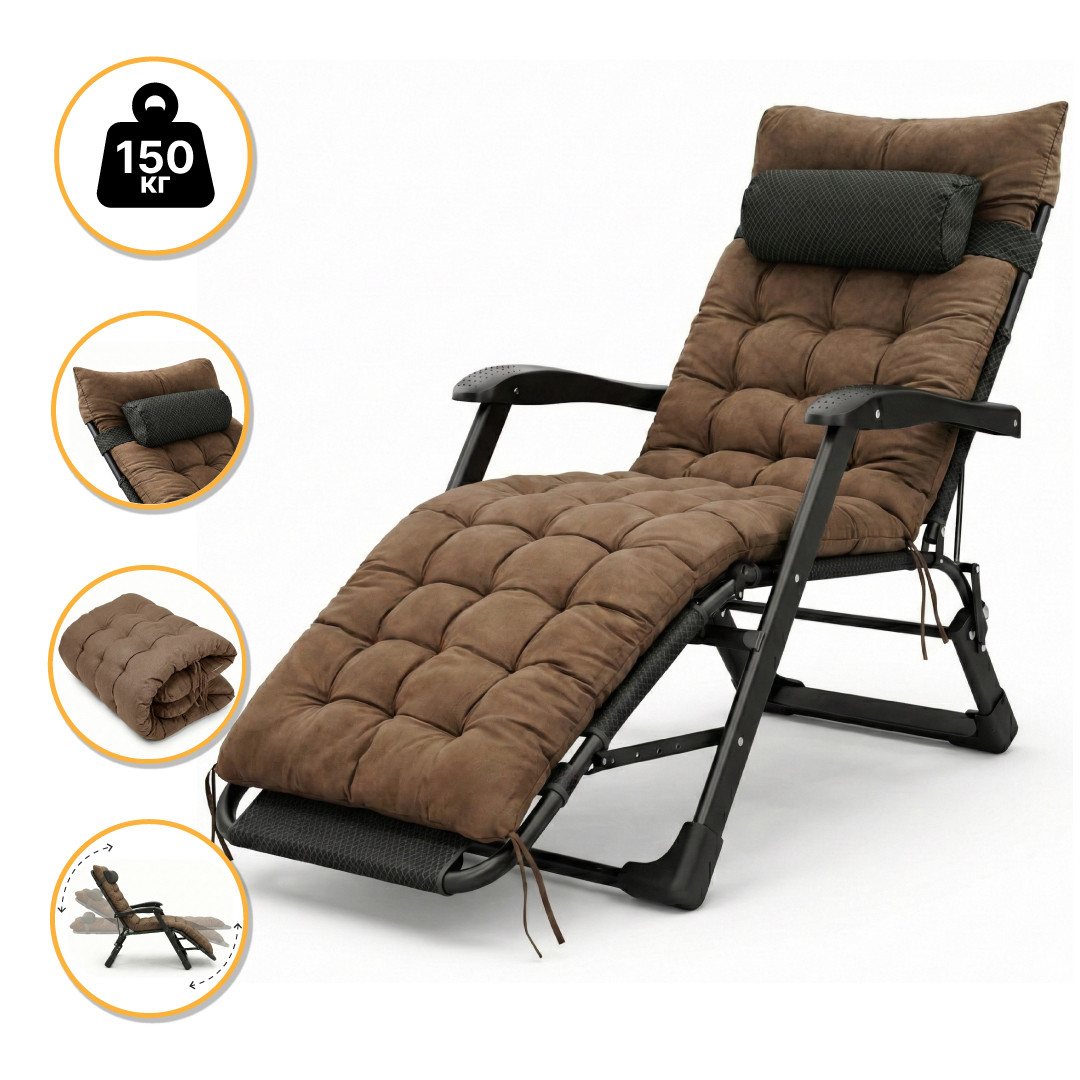 Крісло-шезлонг з подушкою та матрацом LEOBRO, Темна смужка Стильне та комфортне крісло-шезлонг LEOBRO – ідеальний вибір для відпочинку на природі, біля басейну, саду або на пляжі. В комплект входить м'який матрац, який забезпечує зручність та розслаблення. Переваги: - Ергономічний дизайн: Підходить для розслаблення в будь-якому положенні. - Мобільність: Легка складна