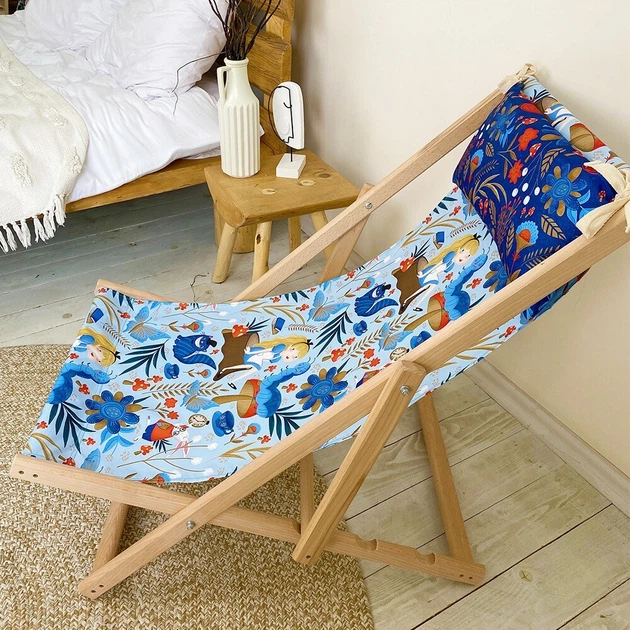 Шезлонг розкладний дерев’яний з подушкою та принтом Аліса в країні чудес - садовий лежак для кафе, тераси, балкона або дачі