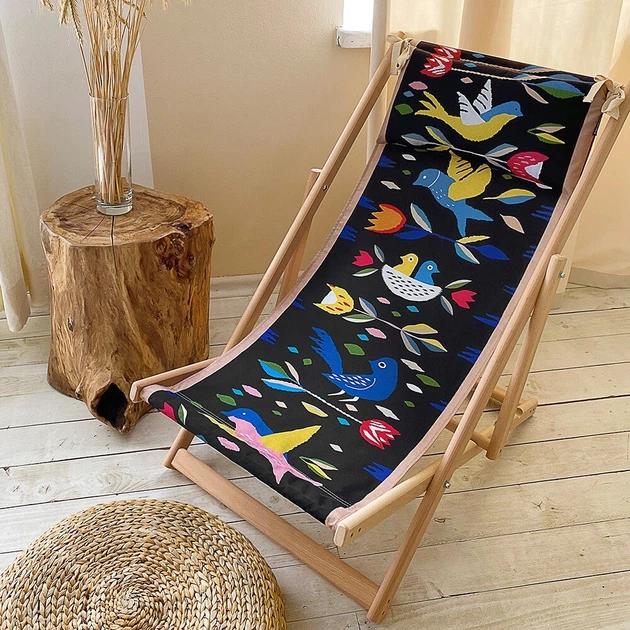 Шезлонг розкладний дерев’яний з подушкою та принтом Пташки - садовий лежак для кафе, тераси, балкона або дачі