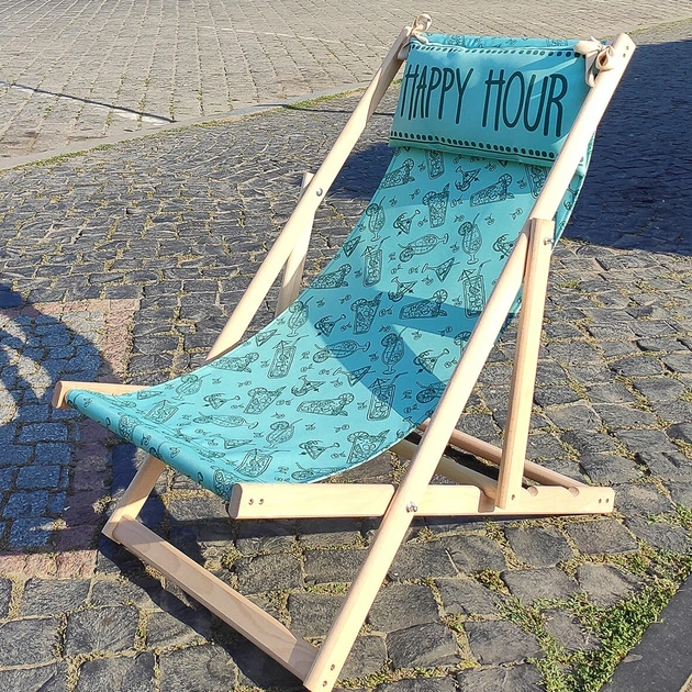 Шезлонг розкладний дерев’яний з подушкою та принтом Happy hour - садовий лежак для кафе, тераси, балкона або дачі