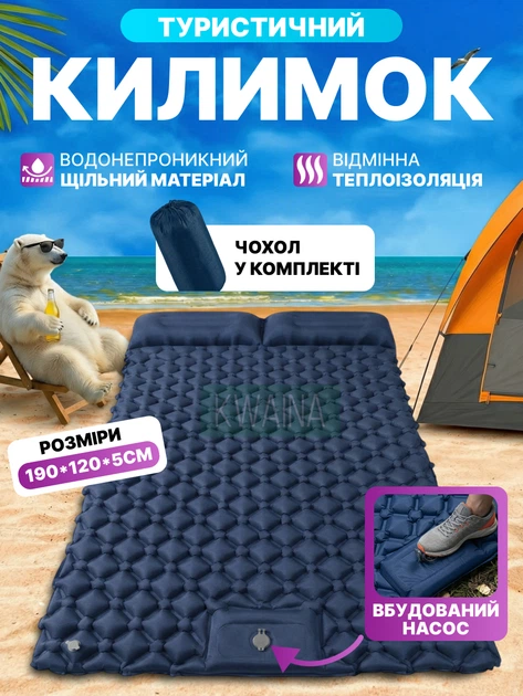 Матрац надувний туристичний 190х120 двомісний з вбудованим насосом, каремат для кемпінгу з подушками, килимок в намет, синій