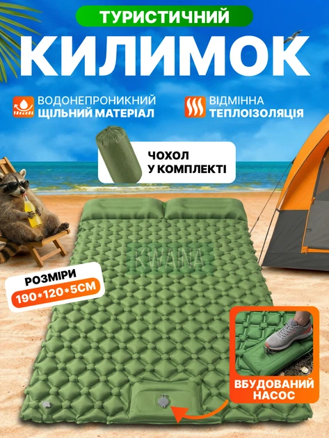 Матрац надувний туристичний 190х120 двомісний із вбудованим насосом, каремат для кемпінгу з подушками, килимок у намет, зеле
