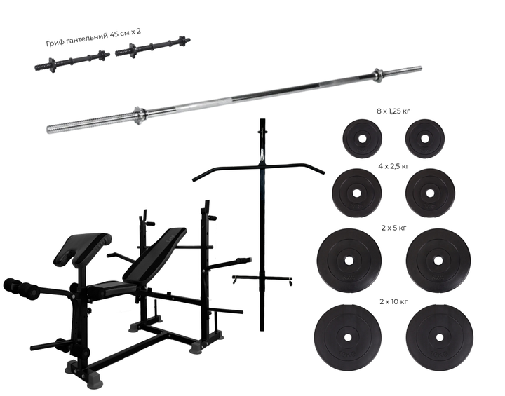 Багатофункціональна лава для жиму WCG 0090 + Тяга + Брусья + Приставка скота Набір HARD штанга 60 КГ