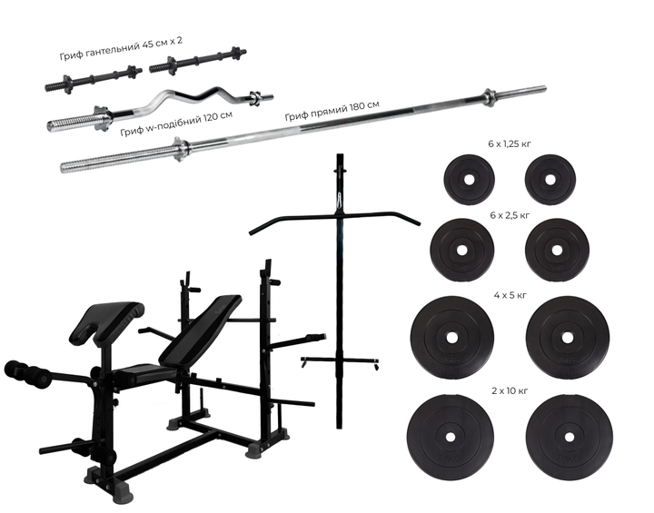 Багатофункціональна лава для жиму WCG 0090 + Тяга + Брусья + Приставка скота Набір HARD штанга 98 КГ
