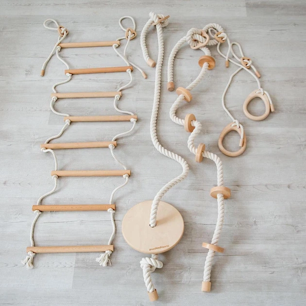 Набір мотузкових аксесуарів до спортивних стінок 4-в-1: Канатна драбинка, Гімнастичні кільця, Канат зі сферами, Гойдалка з к