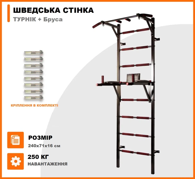 Шведська Стінка Металева з Турніком та Брусами Професійна (до 250 кг), Стаціонарний Комплекс 3 в 1, 240 см