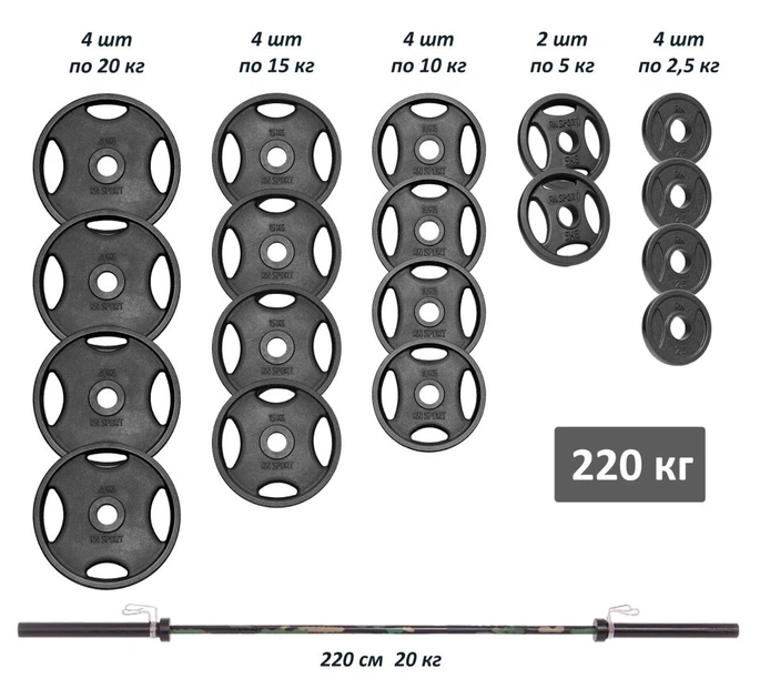 Штанга олімпійська 220 кг з прогумованими металевими дисками RN-Sport