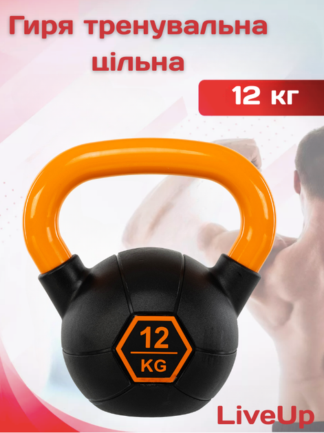 Гиря тренувальна цільна гумова з пофарбованою ручкою LiveUp Urethane competition kettlebell UAZE5336-12 12кг (чавун, чорний-