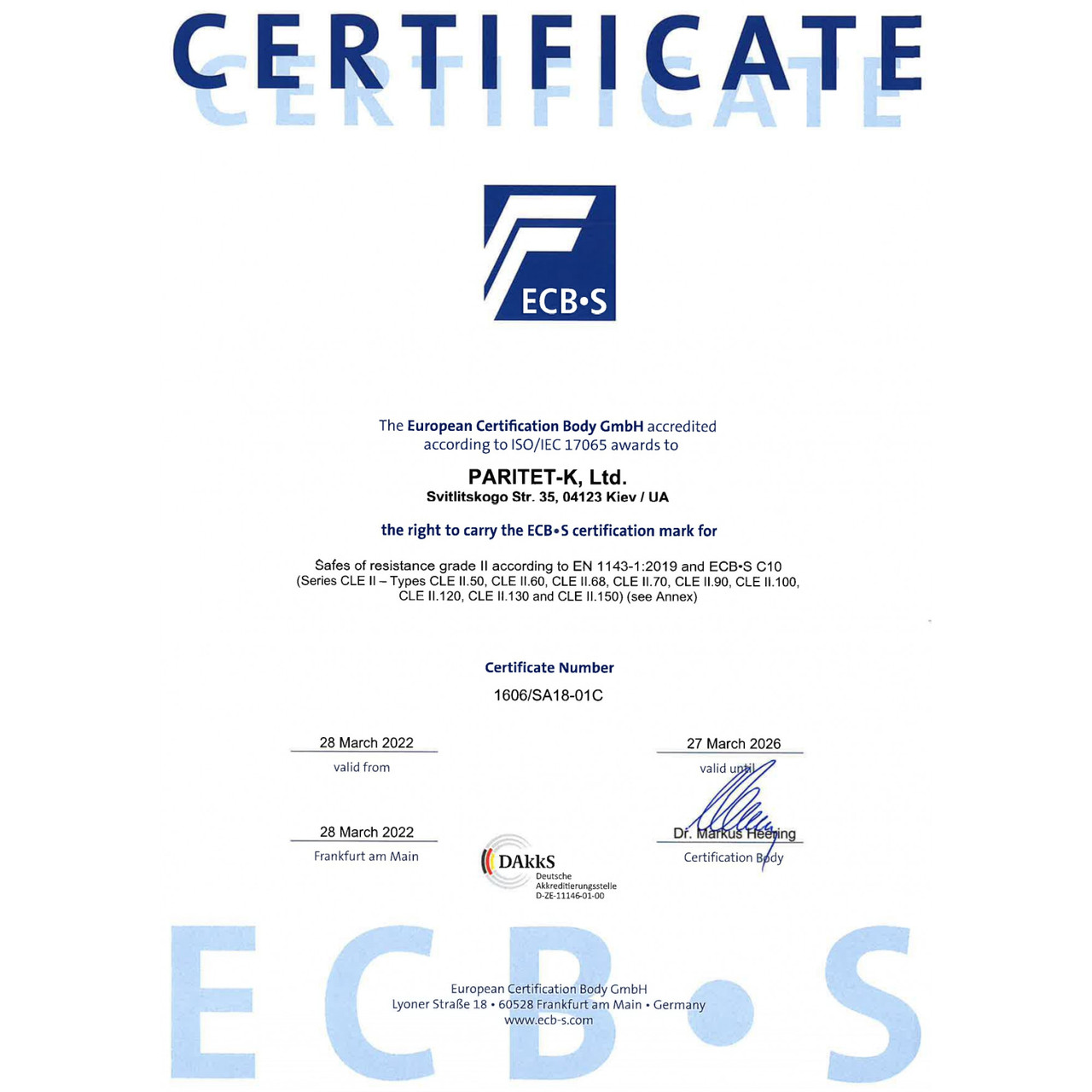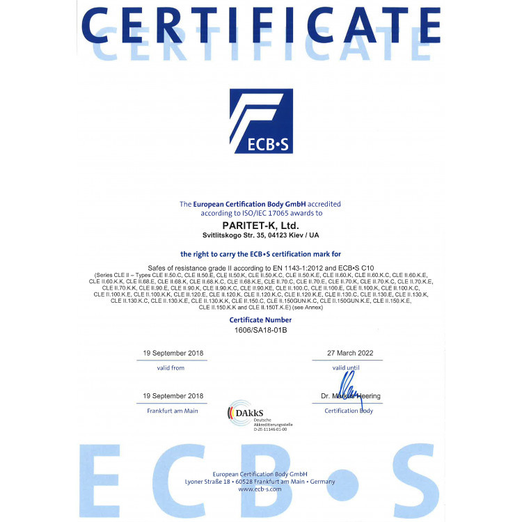 Огнестойкие сейфы TM Griffon серии CLE II сертифицированы Европейским органом сертификации ECB-S по ІІ классу сопротивления к излому по EN 1143-1, имеют защитный слой корпуса и дверей - фортификационный взломостойкий бетон толщиной 55 мм. Соответствуют классу огнестойкости LFS 30P ДСТУ EN 15659. Ключевые особенности сейфов серии CLE II – наполнение стенок фортификационным бетоном, что позволяет