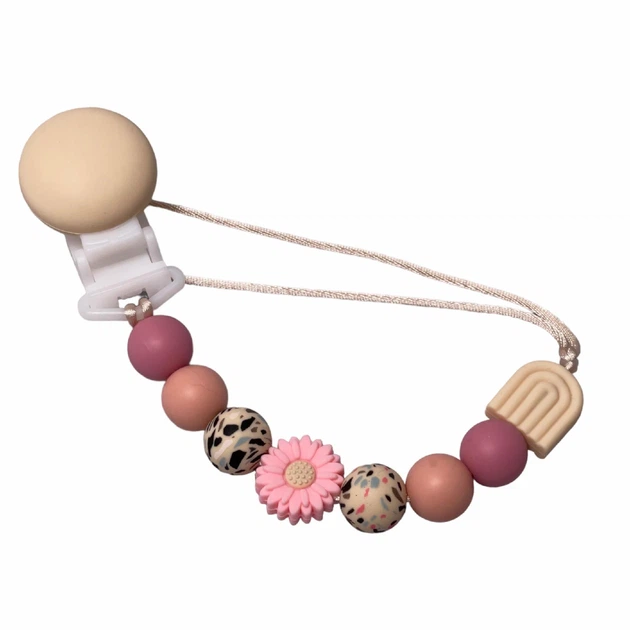 Тримач для пустушки з харчового силікону Ромашка, рожевий з білим 1 шт.
