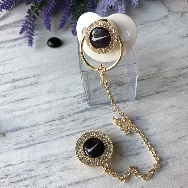 Комплект соска пустушка з утримувачем зі стразами в стилі Nike білий