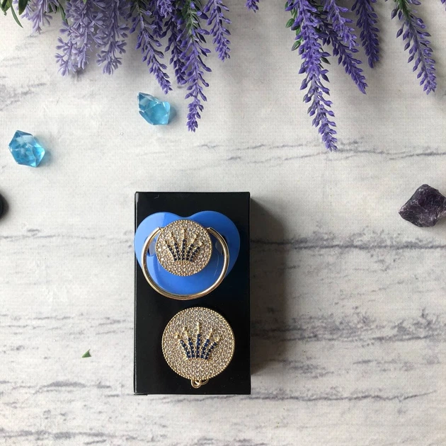 Комплект соска пустушка з утримувачем зі стразами Корона блакитний