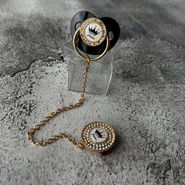 Брендовий комплект соска пустушка з утримувачем зі стразами з короною чорний