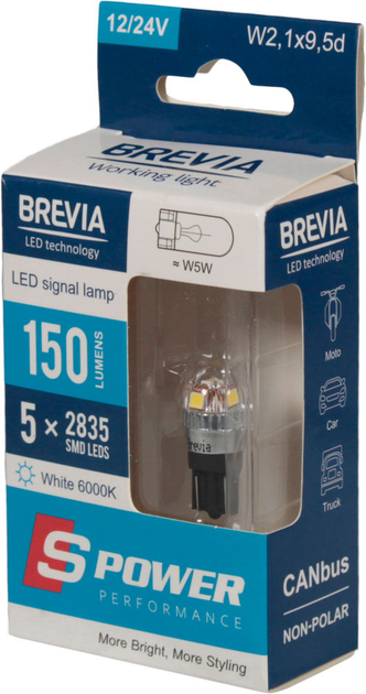 Лампочка без цоколя LED T10W5W SMD біла 5-діодів 12/24V W2.1x9.5d CANbus (Brevia) (к-т.-2шт.) 10208X2