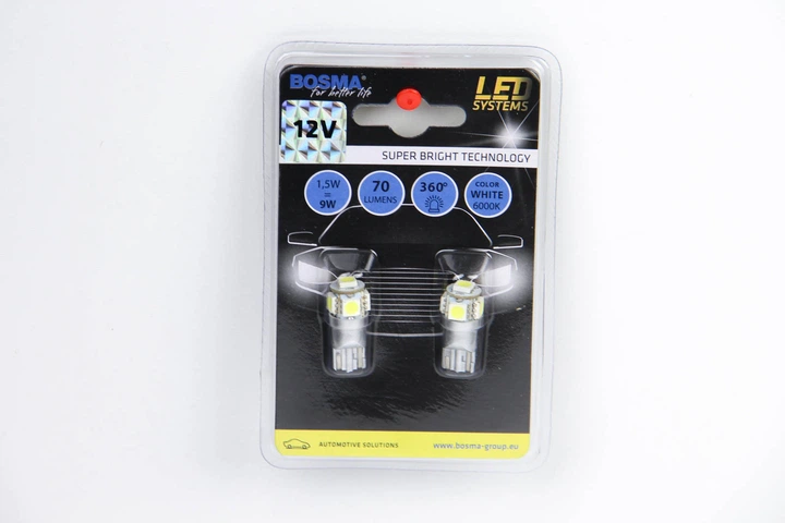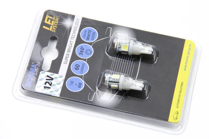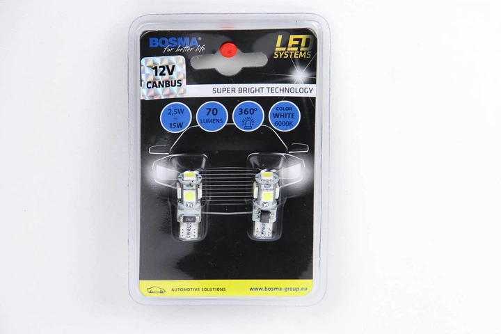 Автолампа T10 LED 12V 5XSMD 5050 LED WHITE DOUBLE POLARITY CANBUS Упаковка 2шт, BOSMA (4199)