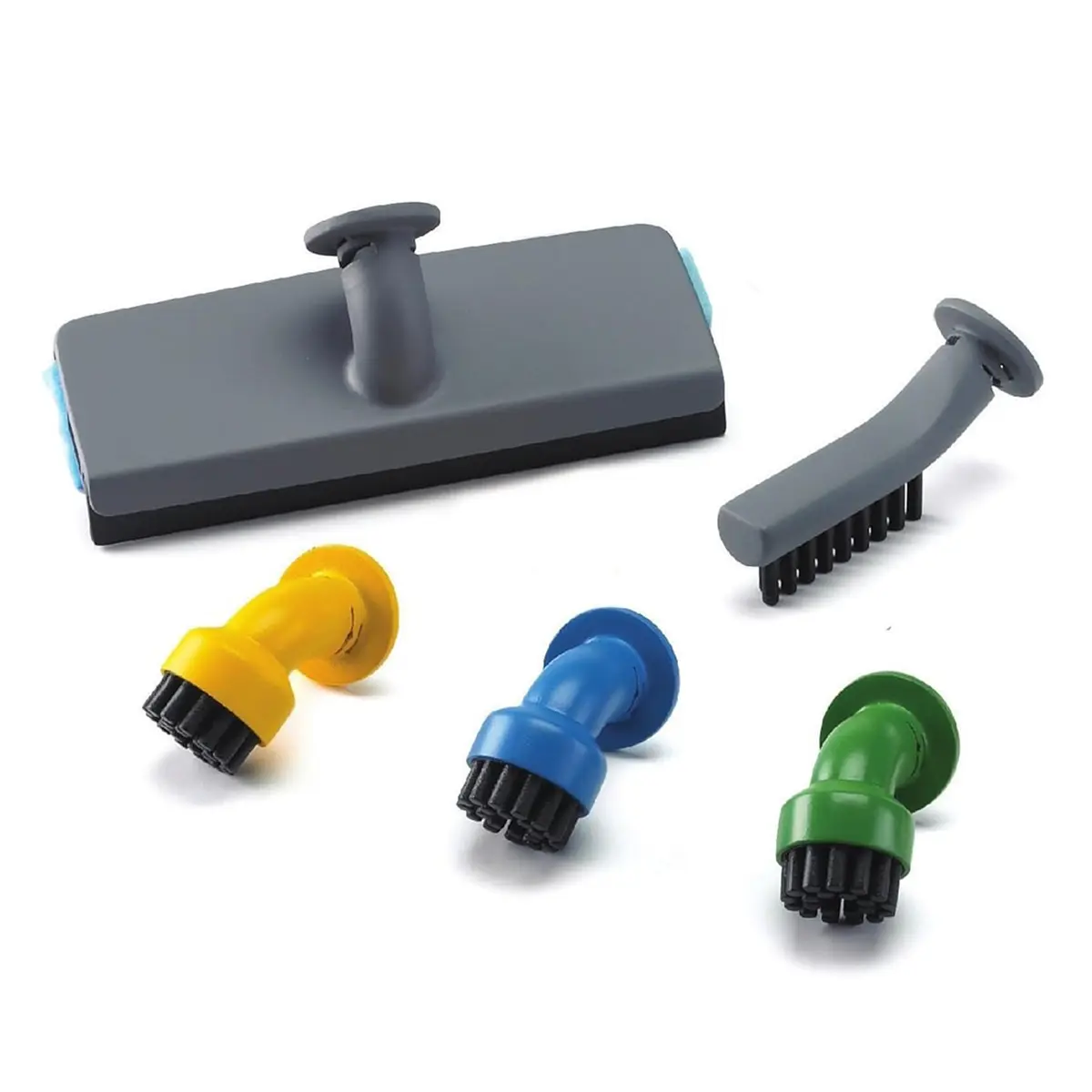 Набор из пяти щеток для пароочистителя. В комплекте широкая прямоугольная нейлоновая щетка, широкая прямоугольная латунная щетка, 3 маленькие нейлоновые щетки разных цветов. • Длина – 18,1 см • Ширина – 7,5 см • Высота – 23,3 см • Вес – 0,292 кг