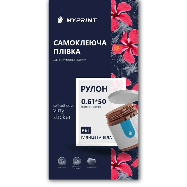 Самоклеюча плівка для струменевого друку My Print PET водостійка, рулон 0,61*50 м, глянцева біла (10985)